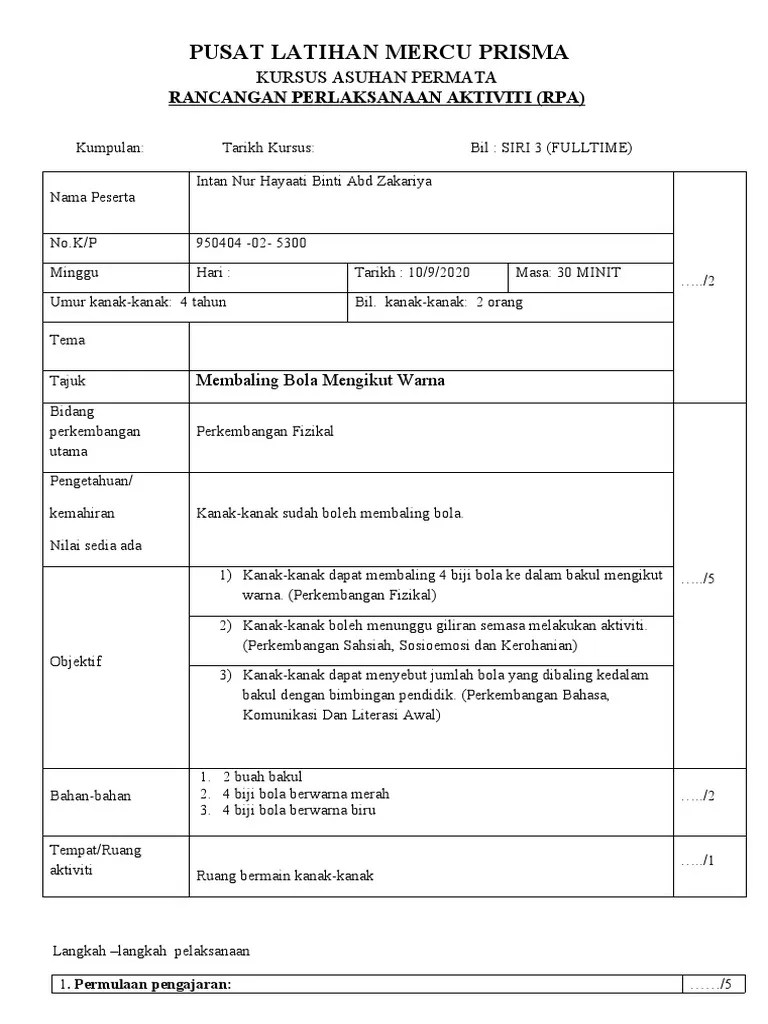 Rpa perkembangan holistik docx rancangan pelaksanaan aktiviti nama pendidik noor aina binti yaziz no kad pengenalan 02 masa 30 minit umur 4 tahun course .